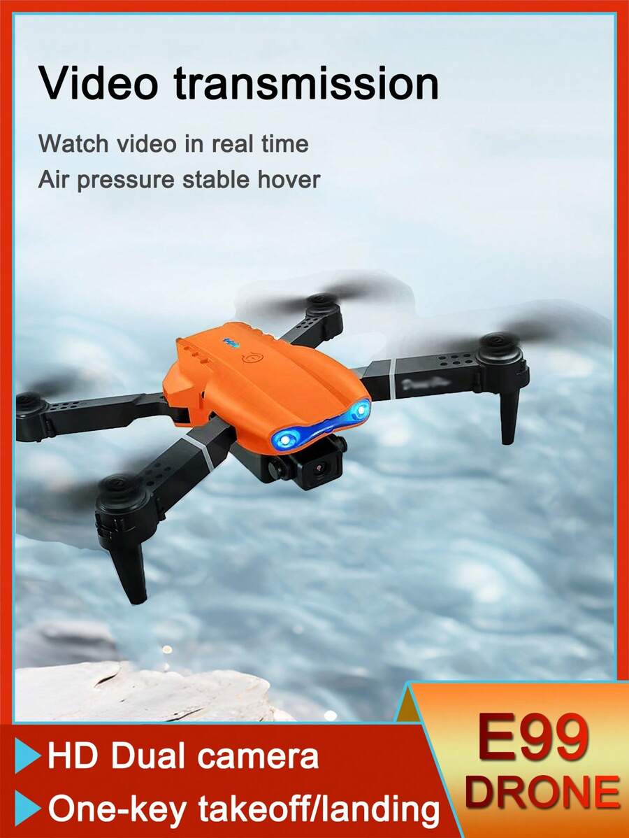 E99升级版初学者入门级遥控无人机。方便可折叠,配有储物袋。它是一款四轴飞行器,配有高清摄像头,可拍摄照片和视频。它具有高度保持功能,