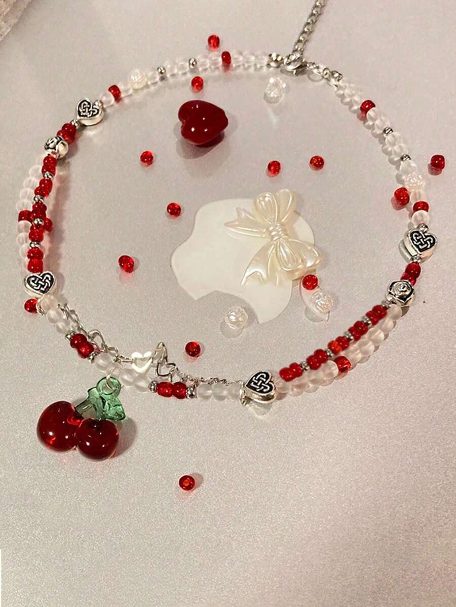 1 件情人节甜美夏日樱桃糖时尚可爱串珠合金吊坠项链、锁骨链、女士/情侣礼物、适合日常佩戴、派对、聚会