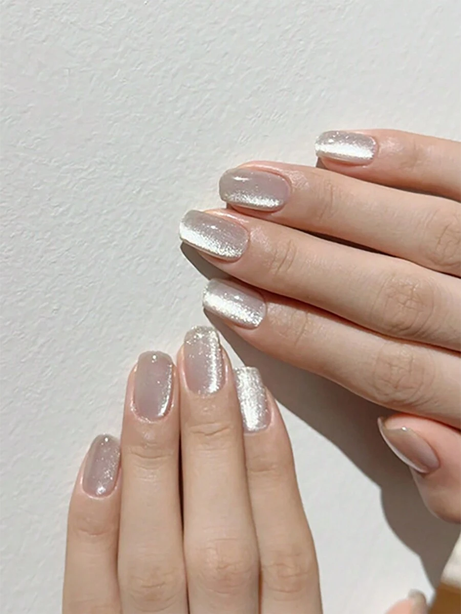32 件短方形按压指甲,银色和白色玻璃仿珍珠猫眼贴花,1 件缓冲剂和 1 件果冻凝胶,包含美甲用品