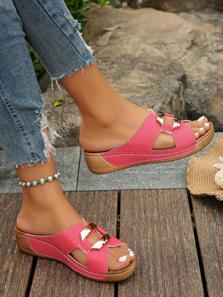 大码 36-45 女士时尚百搭红色压花金属扣露趾坡跟厚底凉鞋,舒适一脚蹬沙滩休闲装