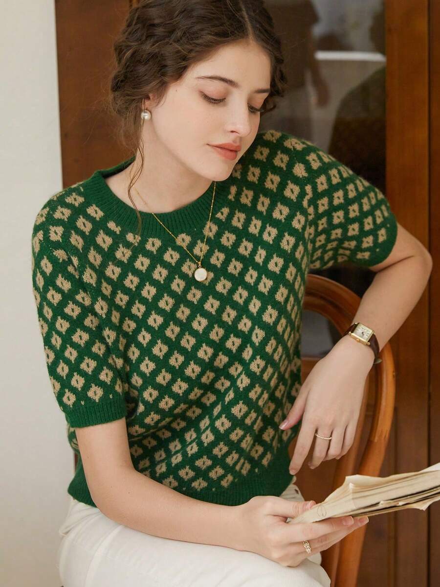 Knit Mix 法式风格女士针织通勤毛衣,花卉图案,撞色短袖T恤,适合春秋季节穿着,简约复古返校季秋季女装