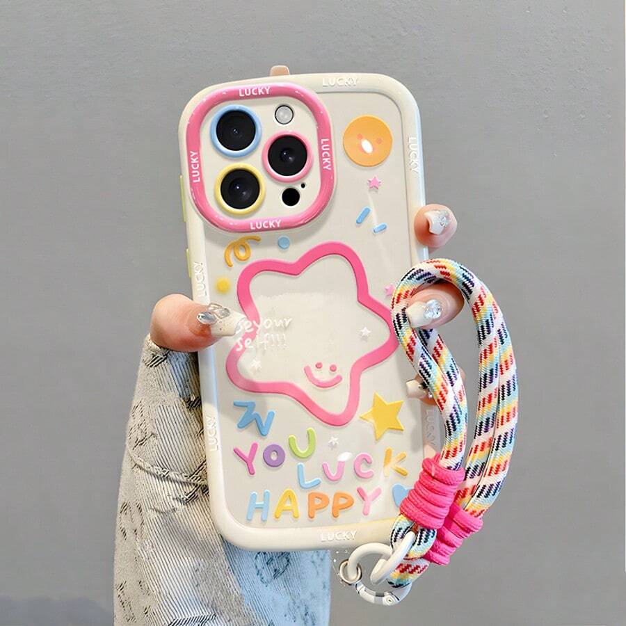 挂绳 1 件彩色星星和字母图案保护硅胶手机壳带腕带,适合青少年,手机壳兼容 iPhone16/7/8/11/12/13/14/15/X/XR/Xs/Plus/Pro/Pro Max/SE2/16E 防水防震防摔防刮