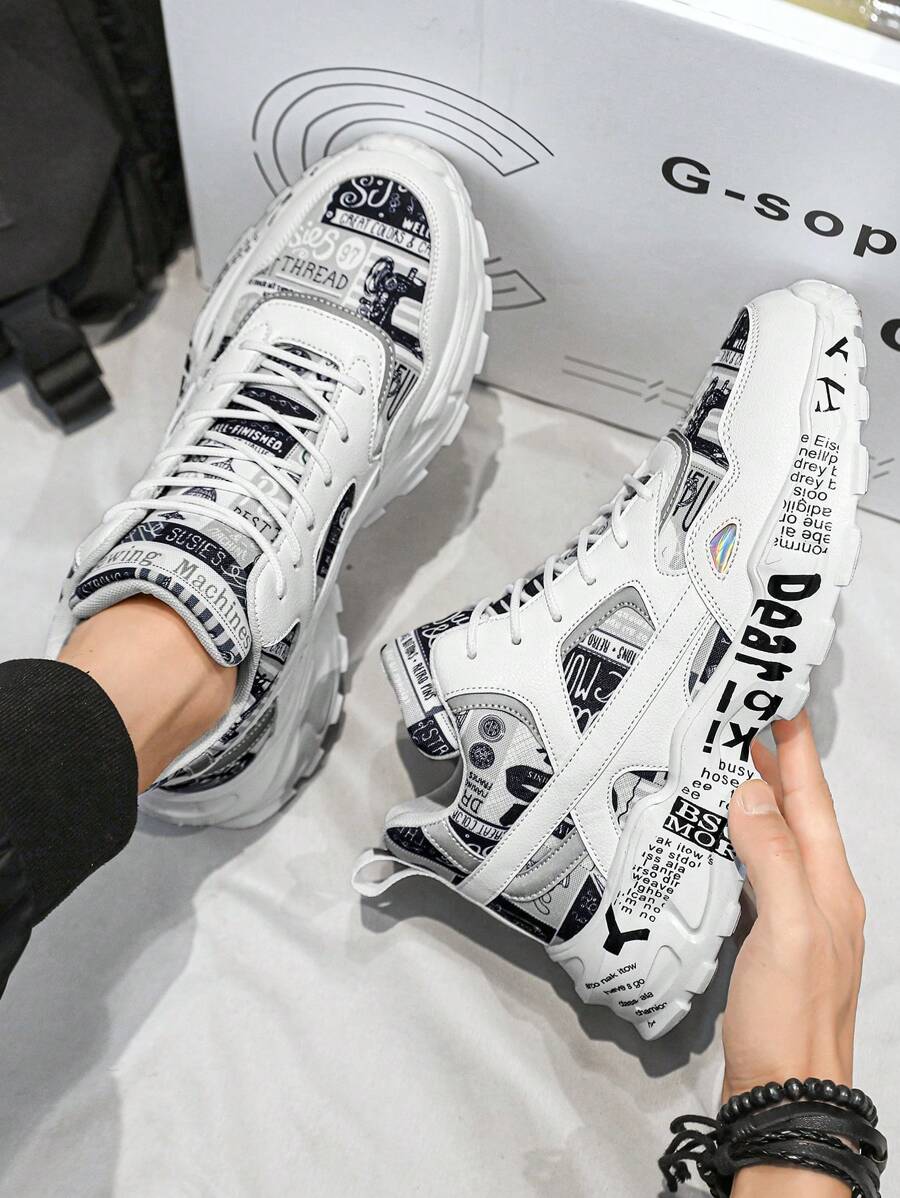 男士撞色随机印花舒适高帮厚底减震百搭休闲运动鞋字母报纸风户外街头时尚复古防滑跑步运动鞋