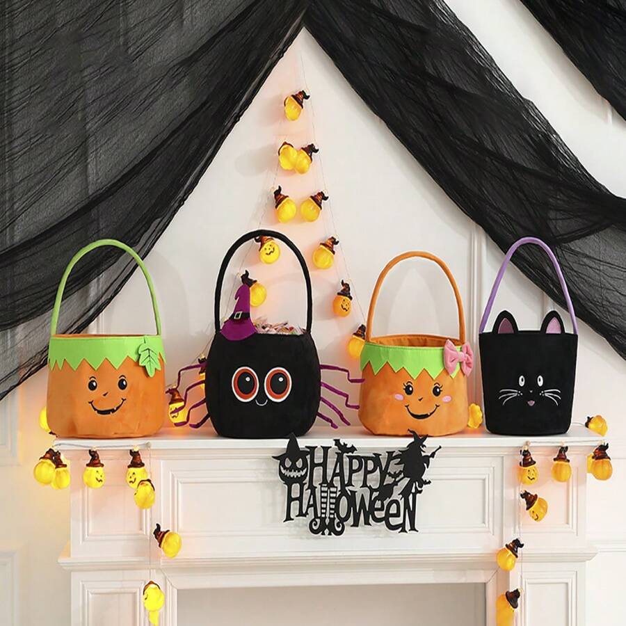 万圣节不给糖就捣蛋蝴蝶结南瓜桶、万圣节南瓜灯糖果篮猫脸蜘蛛桶、不给糖就捣蛋蝴蝶结绿叶礼品篮、篮子收纳、储物盒、万圣节派对装饰用品
