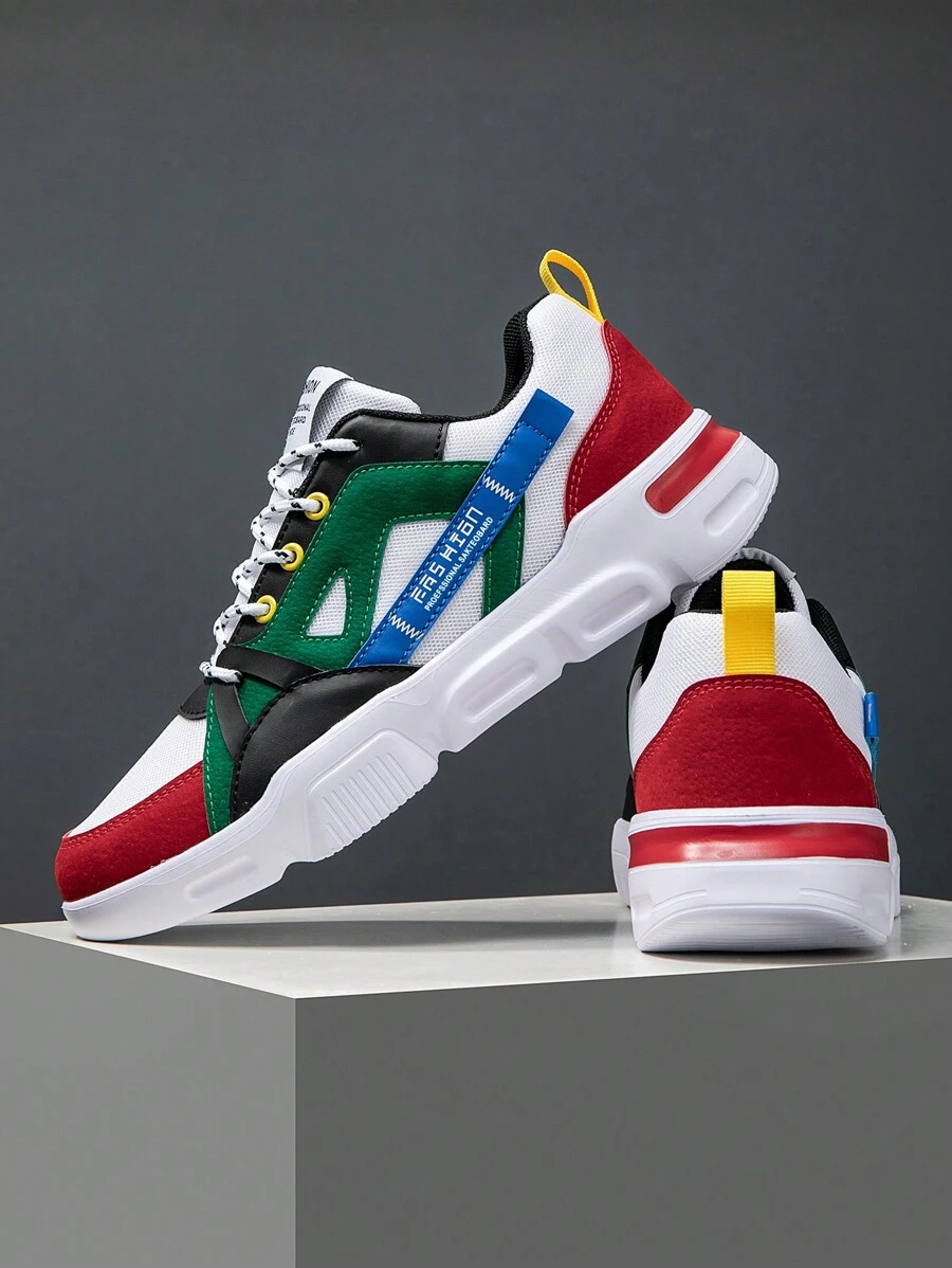 男士个性休闲运动鞋,时尚字母图案前系带白红撞色户外滑板鞋