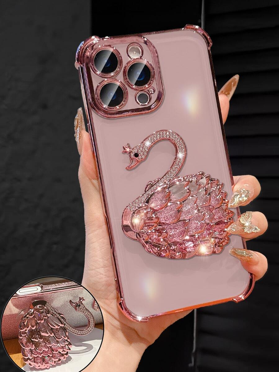 奢华电镀透明粉色手机壳,带创意天鹅支架,水钻闪光 Y2k 风格,防摔,防掉落,夏季新款时尚硅胶防震保护软壳,兼容 16 16e 15 14 13 12 11 X XS XR 8 7 Plus Pro Max Mini、Samgsung Galaxy S24 S25 Ultra、兼容小米 Redmi、兼容华为 Honor OPPO Reno MOTO Infinix Women 2025