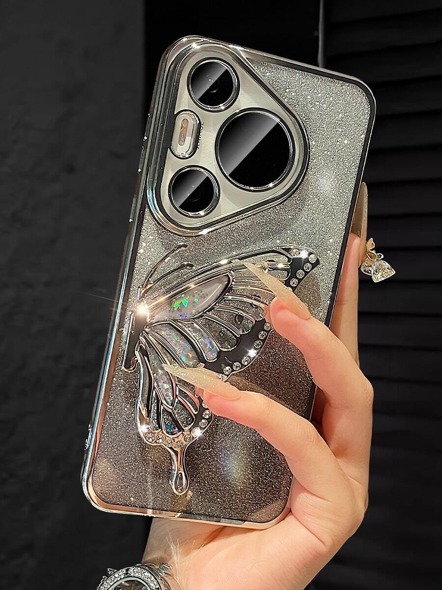 奢华电镀银色手机壳,带蝴蝶液体支架,闪亮水钻风格,新款夏季时尚硅胶防震软壳,兼容三星 Galaxy S24 S25 Ultra FE A56 A16 4G 5G,兼容小米 Redmi 14C,兼容华为 Honor OPPO Reno Realme MOTO Infinix,男女通用 Y2K 风格 2025