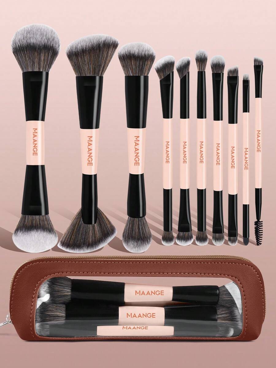 MAANGE 6/11/12件套专业化妆刷套装,包含双头化妆刷、粉底刷、面部刷、粉底刷架、散粉刷、腮红刷、扇形刷、眼影刷、唇刷、眉刷、高光刷、睫毛膏刷等。这套化妆刷是女性和女孩旅行必备的伴侣。