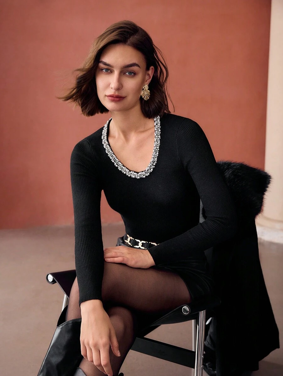 MOTF 仿珍珠饰边修身罗纹针织毛衣