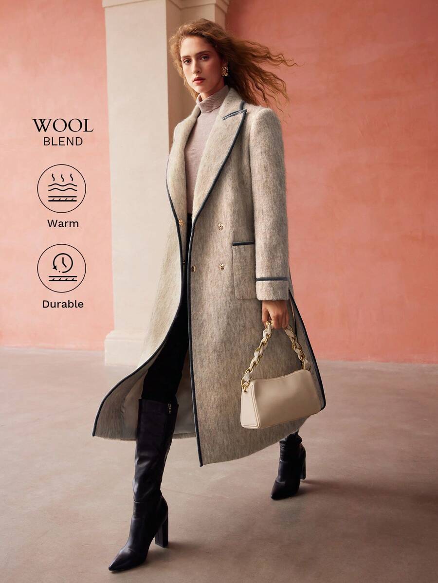 MOTF PREMIUM 系腰带羊毛混纺对比色绑带大衣,女士冬季优雅系腰带、对比色绑带、双纽扣、口袋常规袖翻领宽松杏色羊毛纯色女士大衣,户外活动