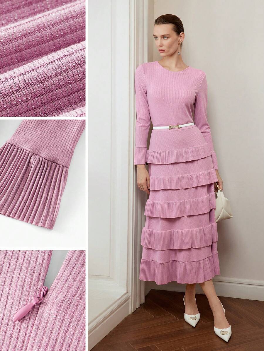 MOTF PREMIUM 纯色喇叭袖层叠荷叶边下摆连衣裙(无腰带)