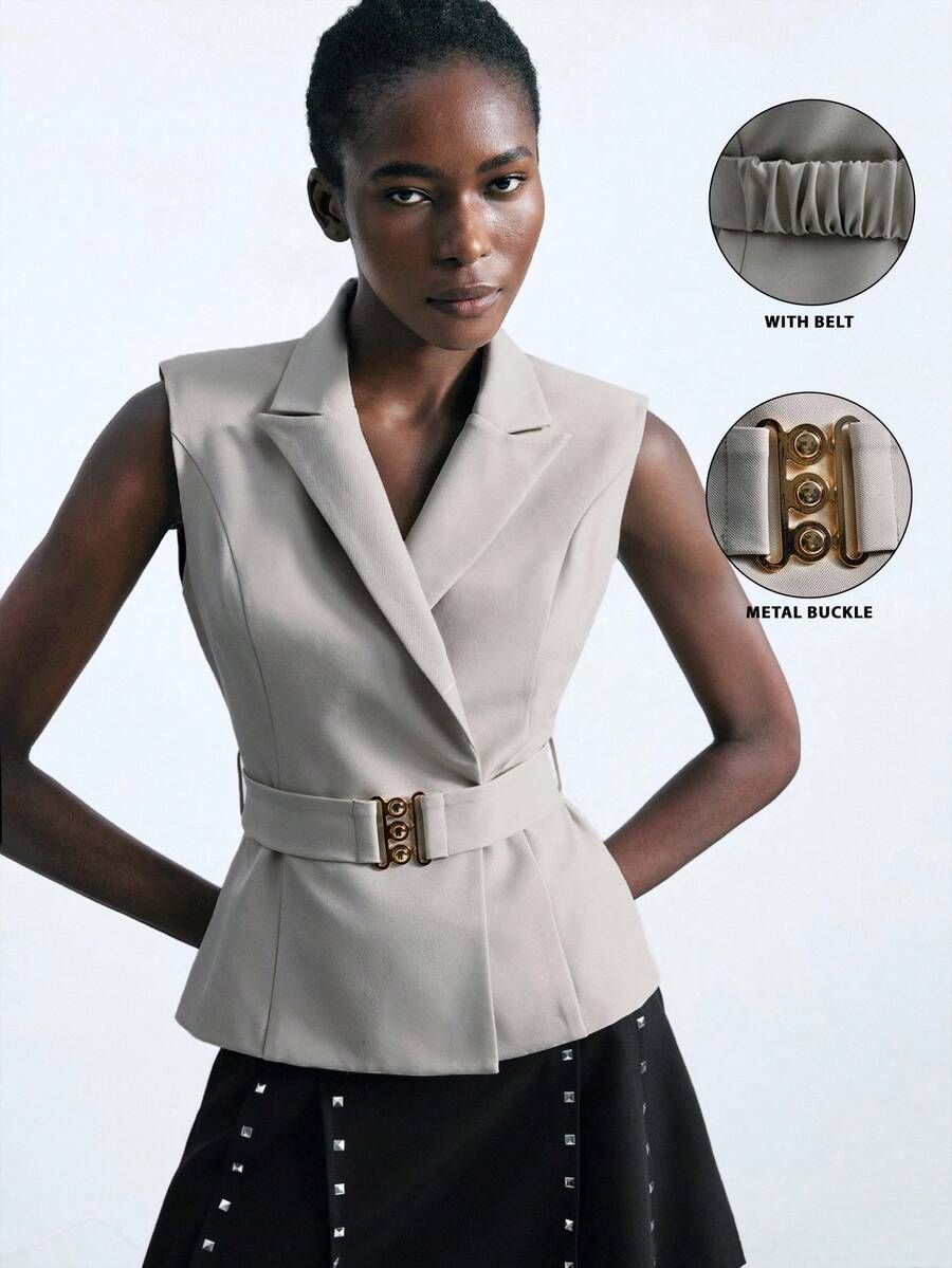 Maija 2025 金属扣设计翻领修身宽肩女背心无袖西装外套女背心女无袖S码秋冬女士