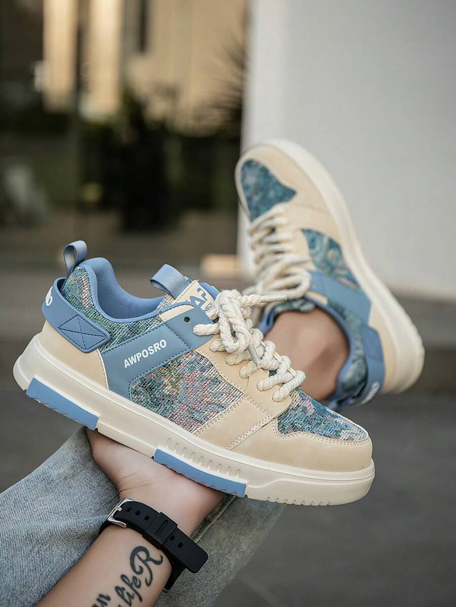 男士复古油画图案系带休闲运动鞋,青少年随机印花防滑透气帆布鞋,百搭
