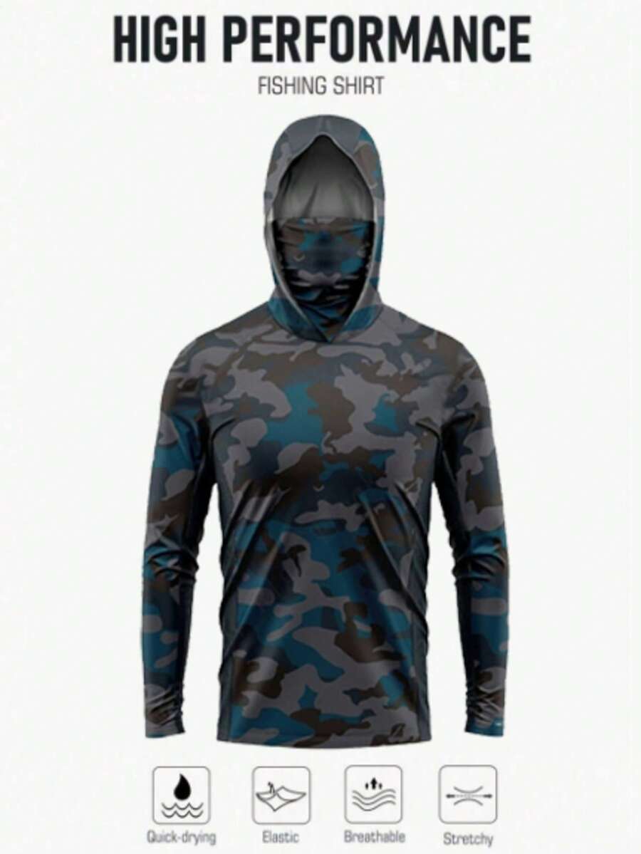男士钓鱼衬衫,长袖,带帽遮面,钓鱼服