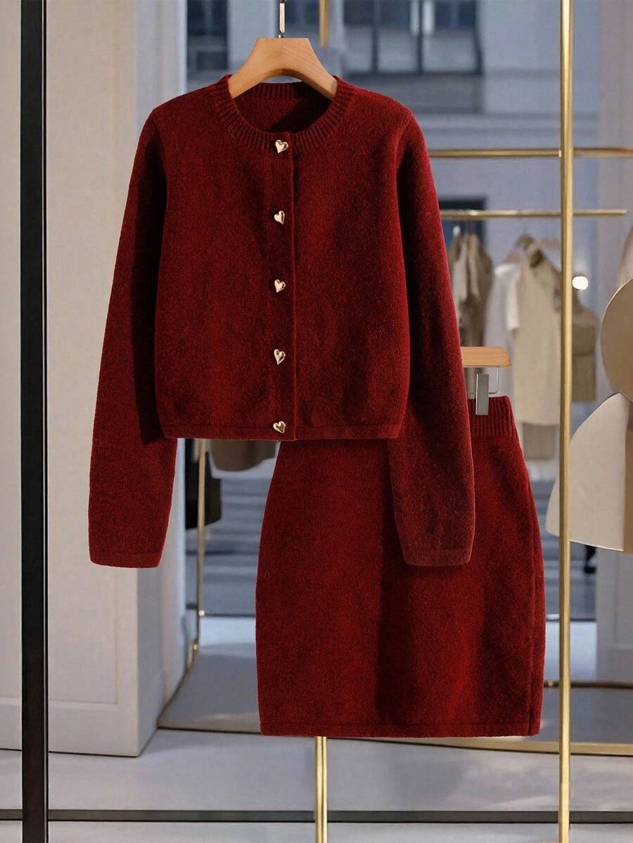 Modelyn 女士纯色优雅心形纽扣单排扣针织开衫和针织迷你裙套装