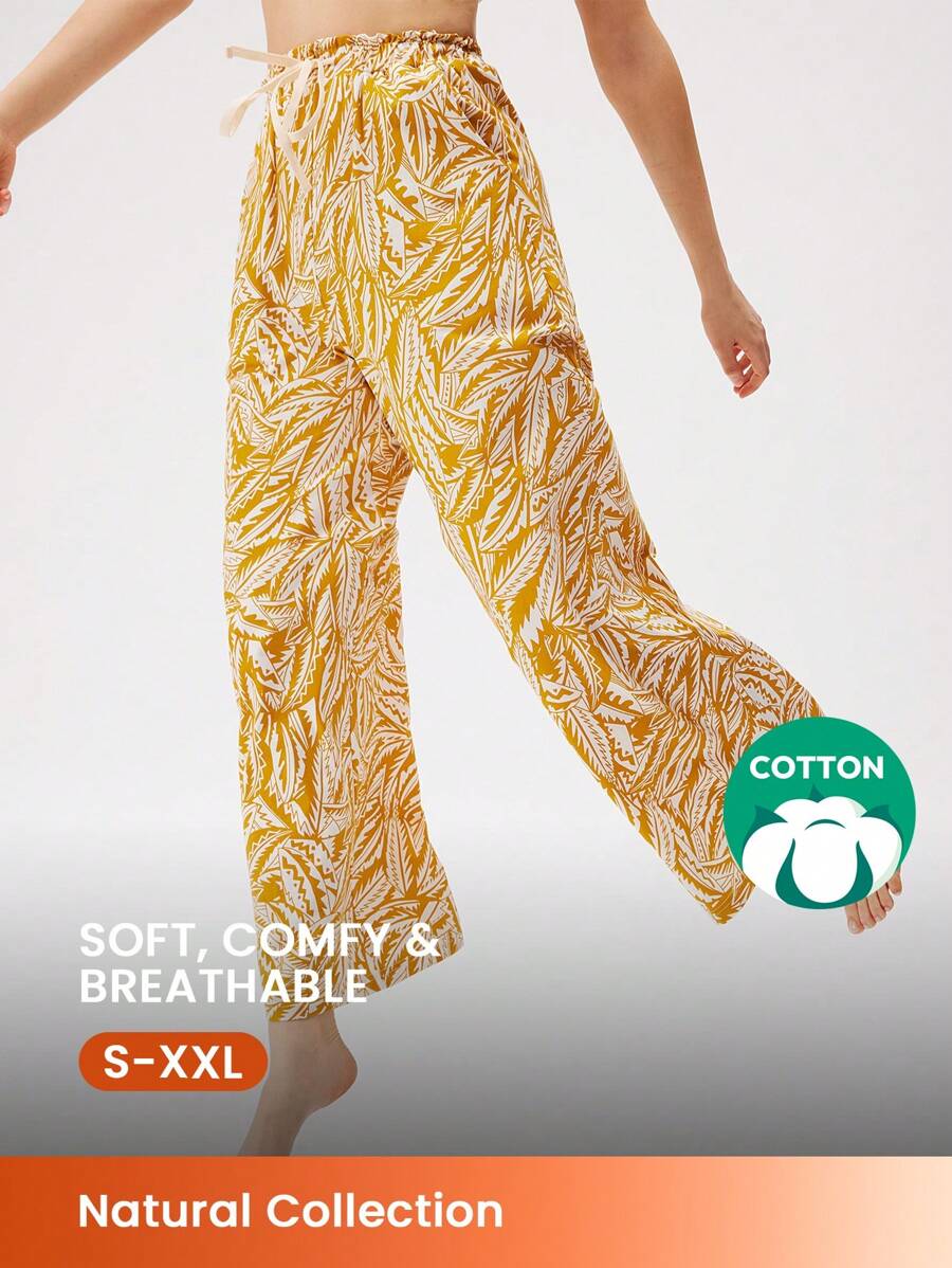 LUVLETTE 岛屿风格黄色柔软棉质基本款阔腿图案家居裤带口袋内衣裤可作为外套透气睡裤