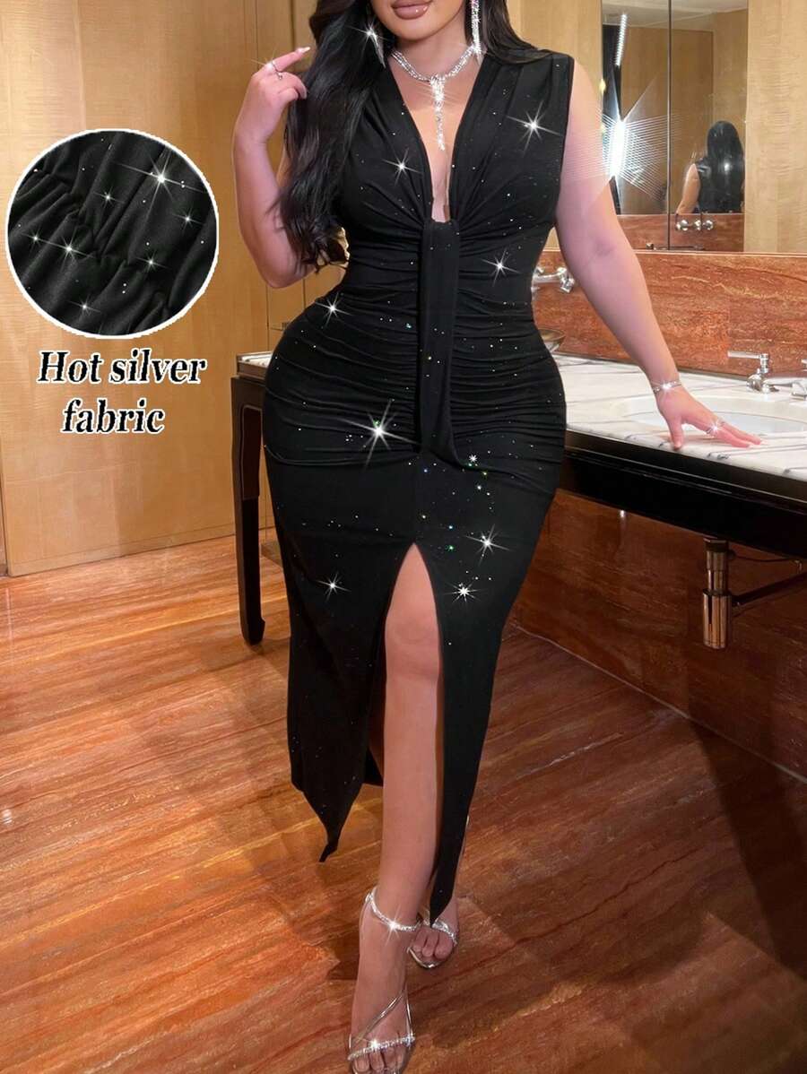 NU&NOW 大码女式优雅闪亮亮片 V 领褶饰高端设计连衣裙,浪漫婚礼宾客、约会之夜、派对时尚