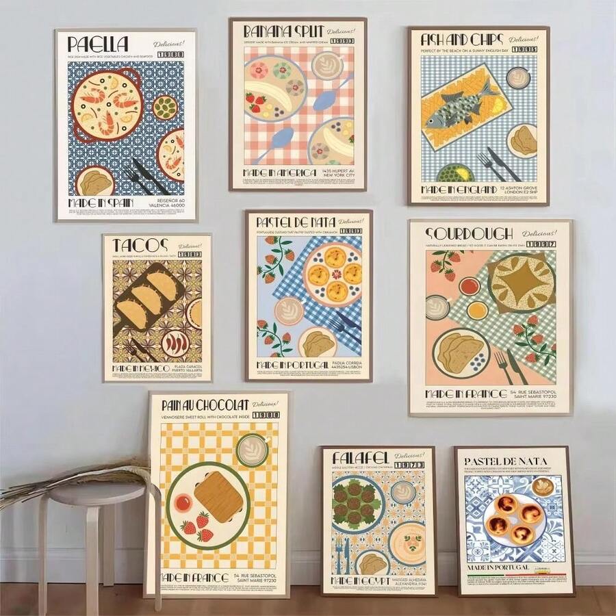 1 件/3 件墙面艺术海报复古咖啡香蕉船寿司拉面复古韩国美食海报精美客厅酒吧美学装饰墙面装饰无框/有框帆布艺术厨房装饰