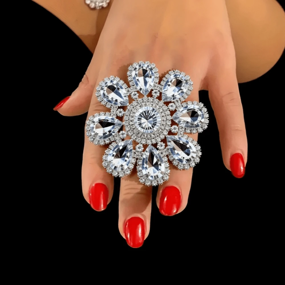 新款夸张亮水滴花大戒指可调节开口设计结婚礼物新娘个性超大时尚水钻戒指