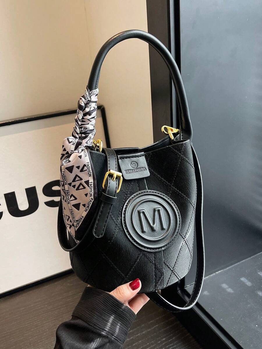 新款时尚纯色pu防水面料小香风钻石纹设计字母图案装饰图案便携水桶包适合旅行逛街送围巾可斜挎。