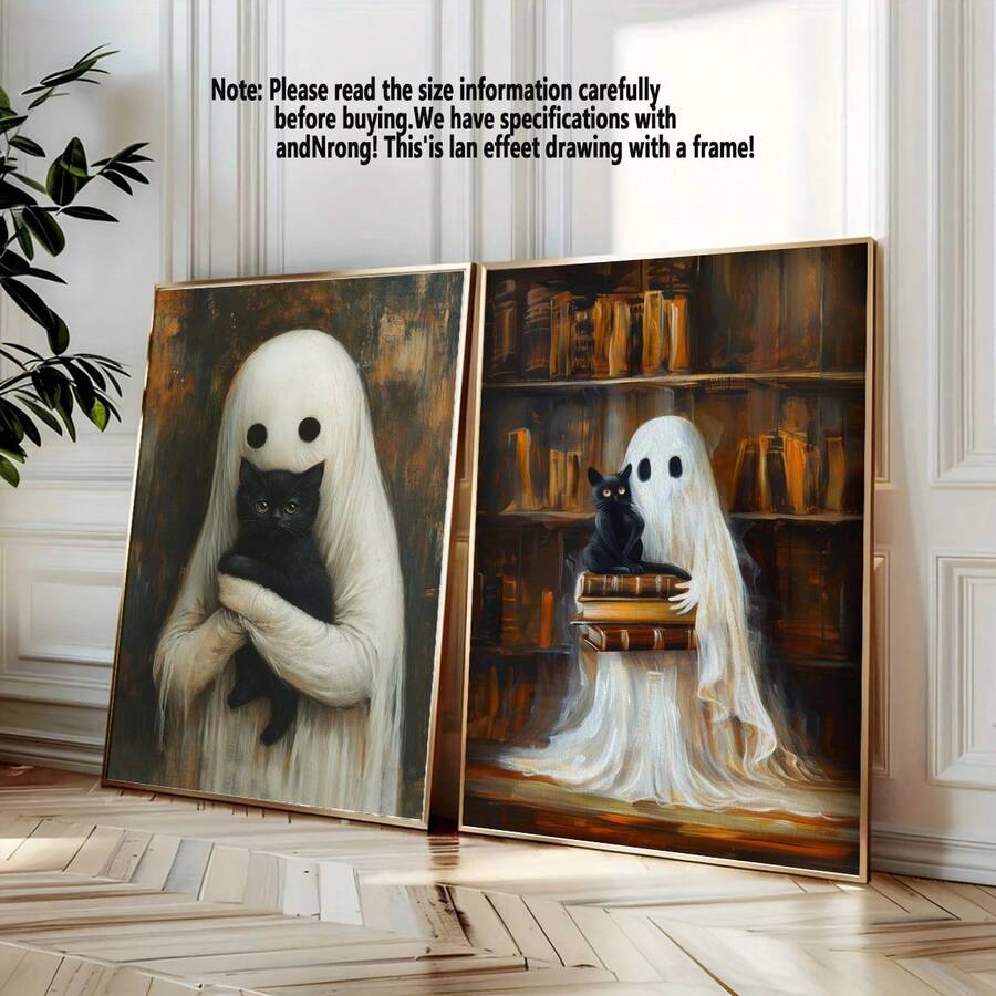 2 件鬼抱着黑猫墙壁艺术、万圣节哥特式海报、恐怖鬼魂印刷品、恐怖猫插图黑暗艺术装饰、图书馆帆布印刷品、墙壁艺术、海报、带框架的墙壁艺术、万圣节家居装饰,适用于客厅、卧室、办公室等 - 非常适合节日、壁画、海报、生日礼物、毕业礼物 - 帆布材料(可选框架)
