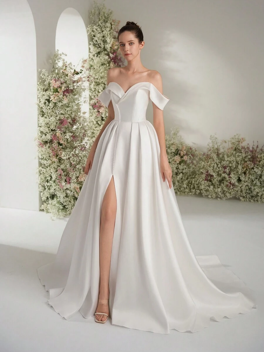 露肩缎面 A 字形珠饰飘逸优雅浪漫奢华拖尾皇家婚纱白色婚纱海滩婚纱婚纱花园婚纱