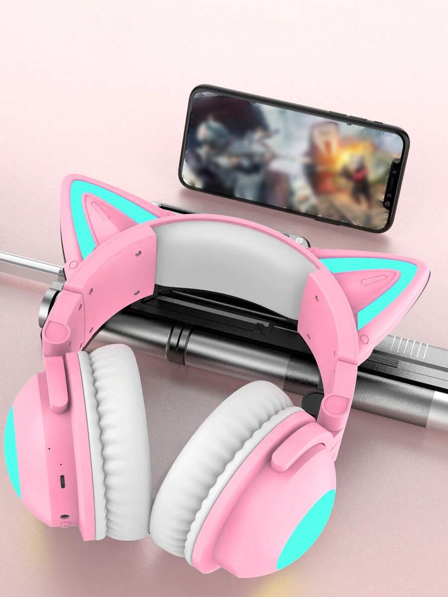 猫咪风格游戏耳机,带彩色 LED 灯,长时间播放,带麦克风,可折叠,深沉低音,HiFi 立体声,适用于平板电脑和手机