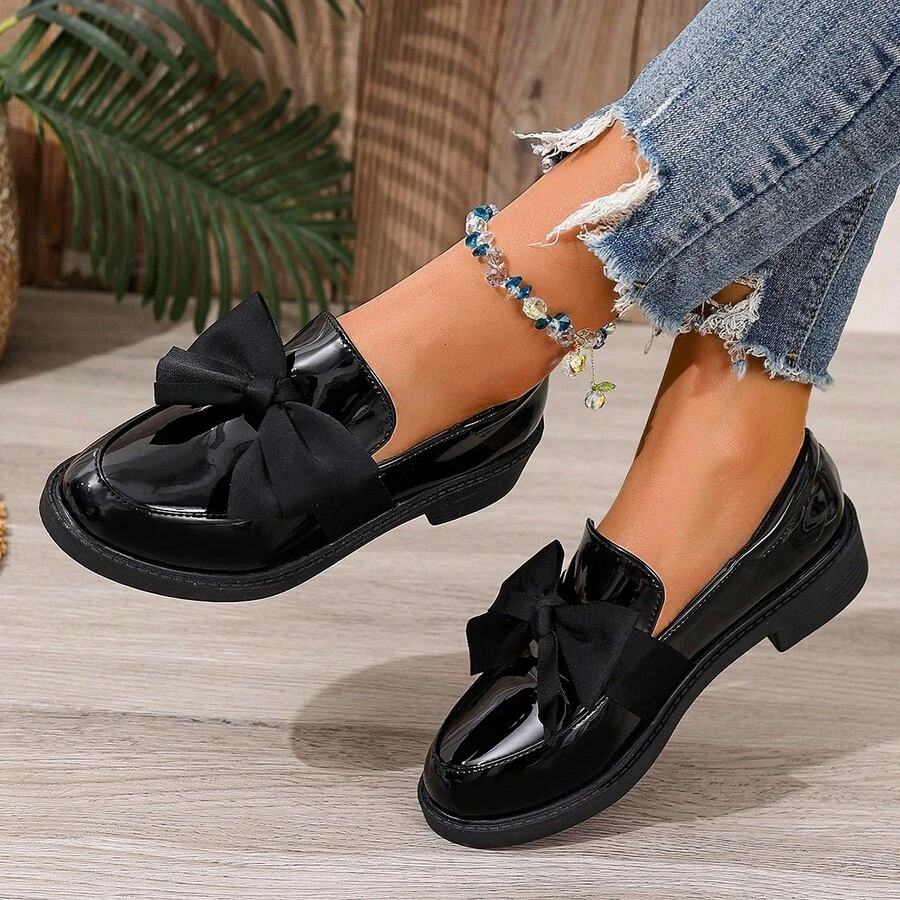 女士时尚蝴蝶结装饰乐福鞋 - 透气天鹅绒一脚蹬鞋,厚底适合所有季节