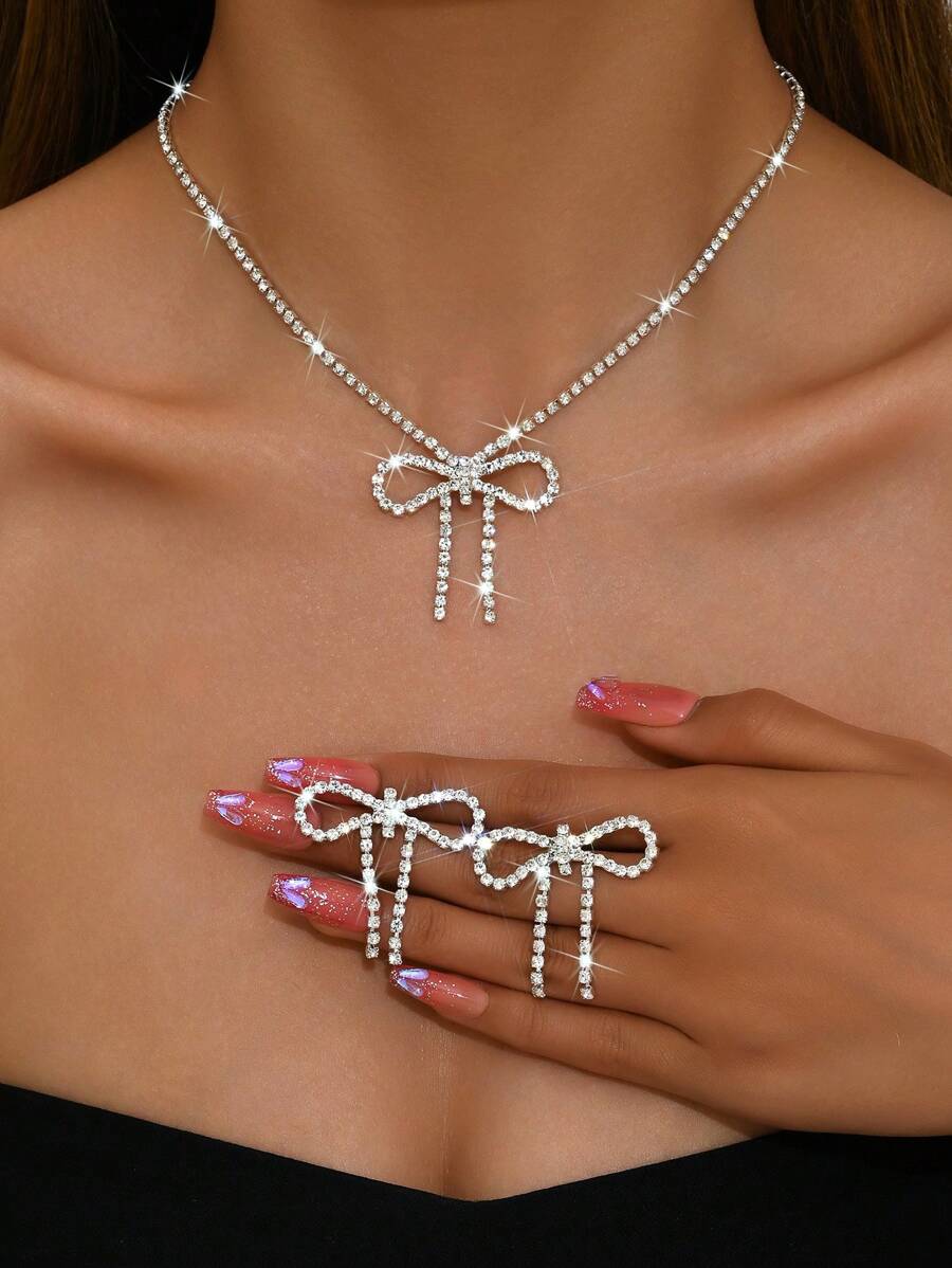时尚简约蝴蝶结项链和耳环套装,女士婚礼首饰,优雅闪亮派对和节日礼物