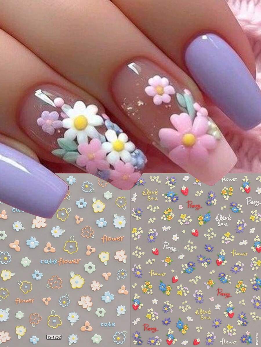 2片装春夏碎花美甲贴纸 - 多巴胺小花、雏菊、睡莲、五瓣花、镂空花、草莓图案,春夏艺术设计,3D立体工艺,适合女性日常生活、婚礼、节日和假期。一次性自粘美甲贴纸,中国风,可爱,简约,清新主题,易于粘贴,美甲装饰贴纸。