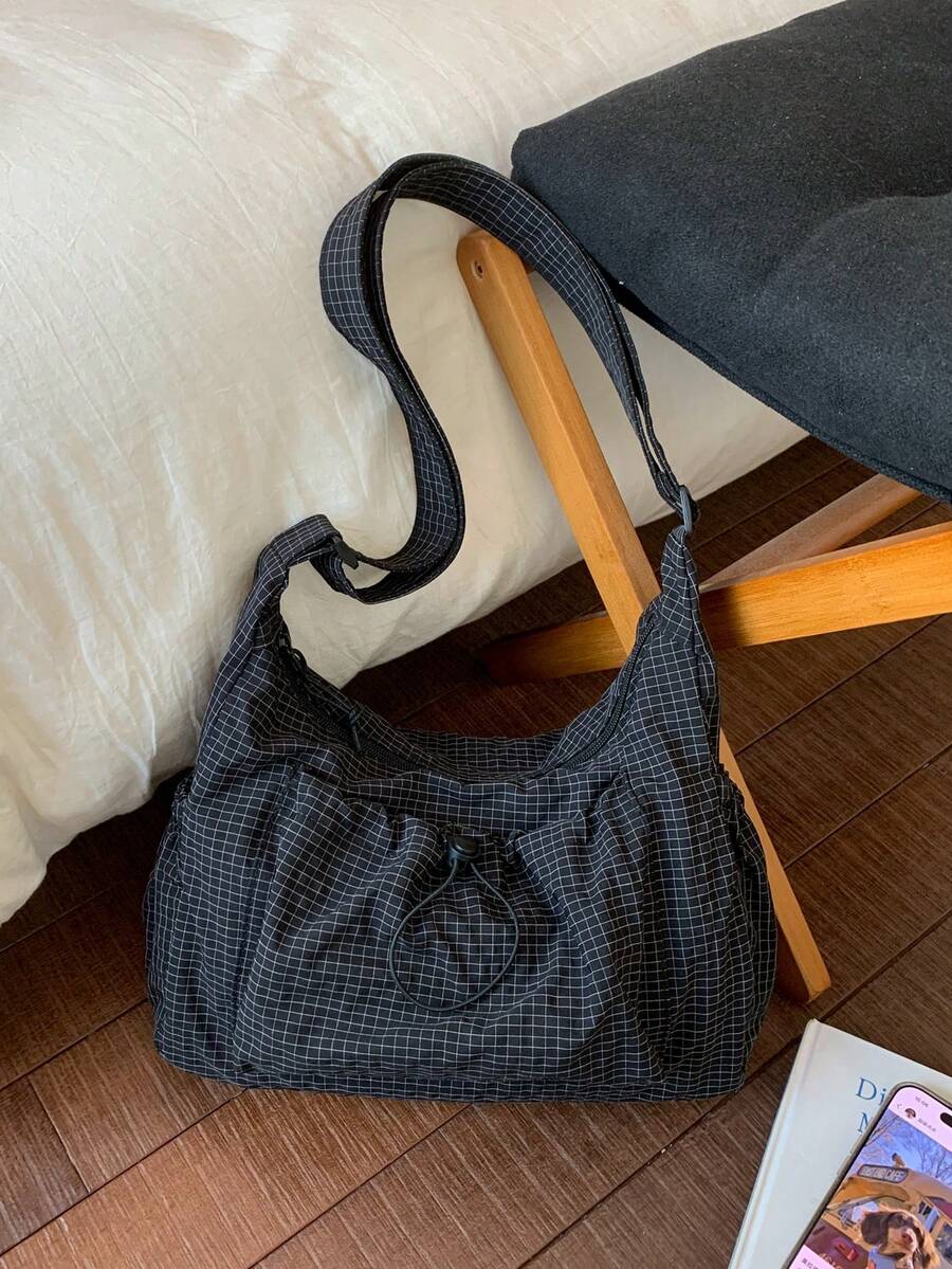 格子女士单肩包,休闲百搭可折叠拉链封口可调节肩带手提包,适合日常使用,学校/大学生,简单可爱的褶皱多口袋抽绳前袋布包