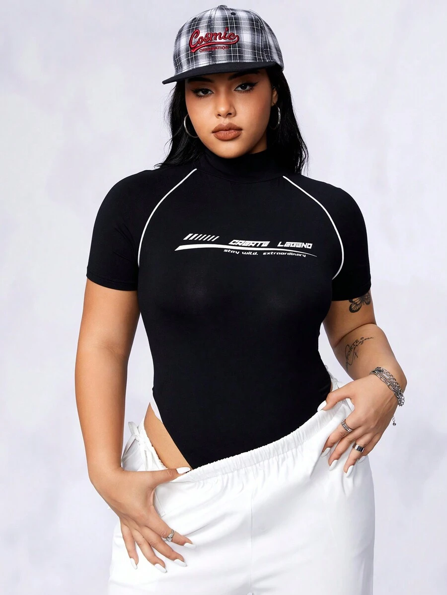SHEIN EZwear 大碼字母圖案拼接滾邊插肩袖連體衣
