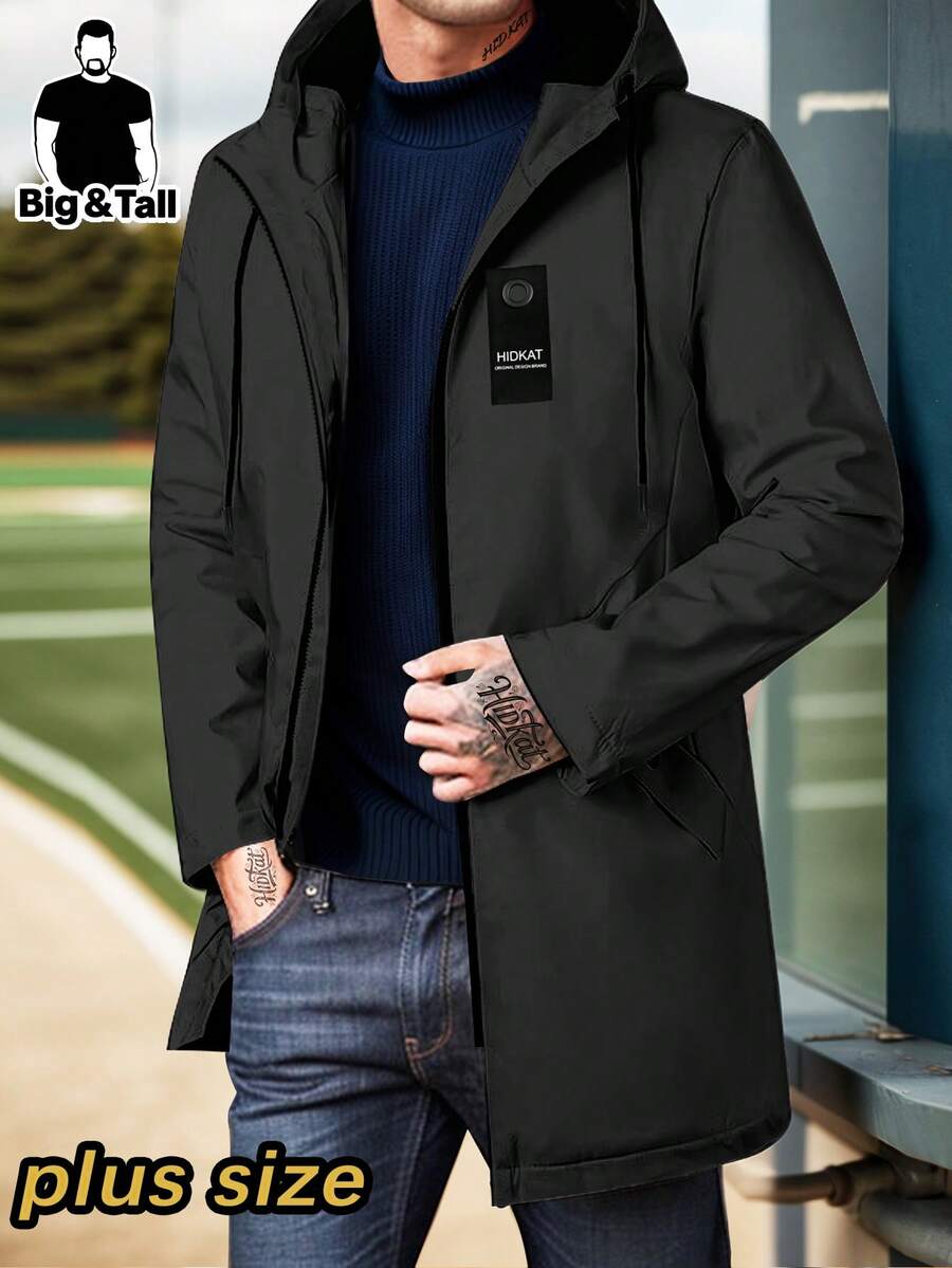 大码男士中长款户外运动徒步夹克,带抽绳连帽,纯色,适合日常休闲穿着