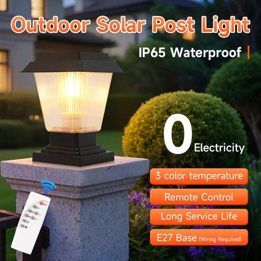 太阳能柱灯带定时器功能,遥控,可调光,防水户外花园太阳能灯,灯光颜色可变,兼容 E27 灯泡,适用于花园、露台、门廊、阳台、柱子、入口、庭院、树木、小路、栅栏、景观照明
