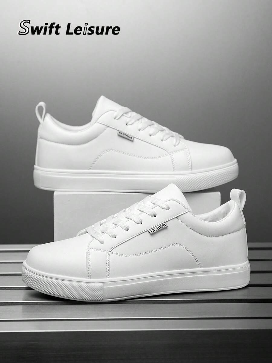 男士时尚简约纯色拼接低帮系带平底基本款白色运动鞋,青少年户外缝线装饰休闲情侣运动鞋