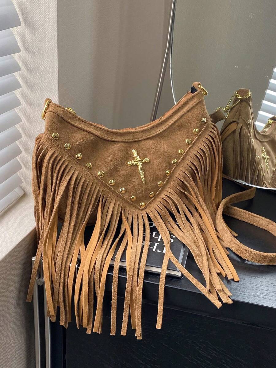 复古棕色流苏包,独特设计,复古西部仿牛仔风格,小众波西米亚斜挎包,用途广泛,适合女性