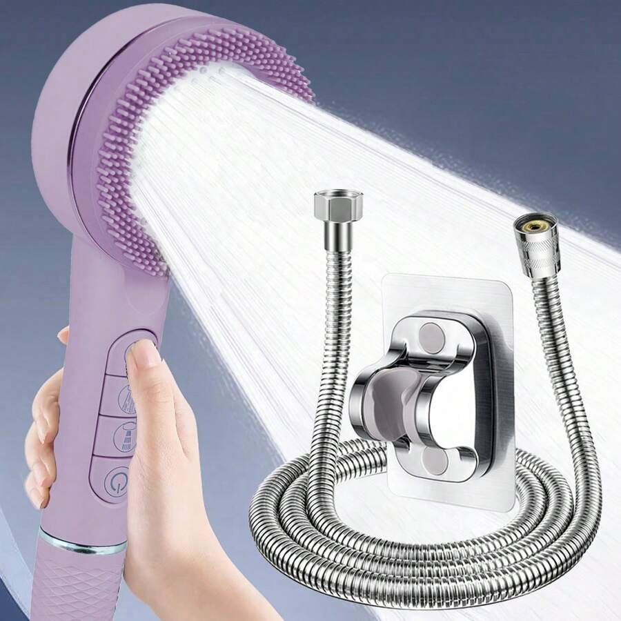 3件套优质ABS材质淋浴套装,4种喷水模式,配备硅胶按摩刷,1.5米不锈钢软管,ABS壁挂支架,无需钻孔,带来美妙的沐浴体验