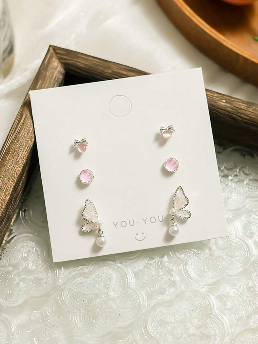 6入組對稱蝴蝶翅膀玻璃耳環樹脂溫和扇形花墜油性蝴蝶釘淺色春季風格