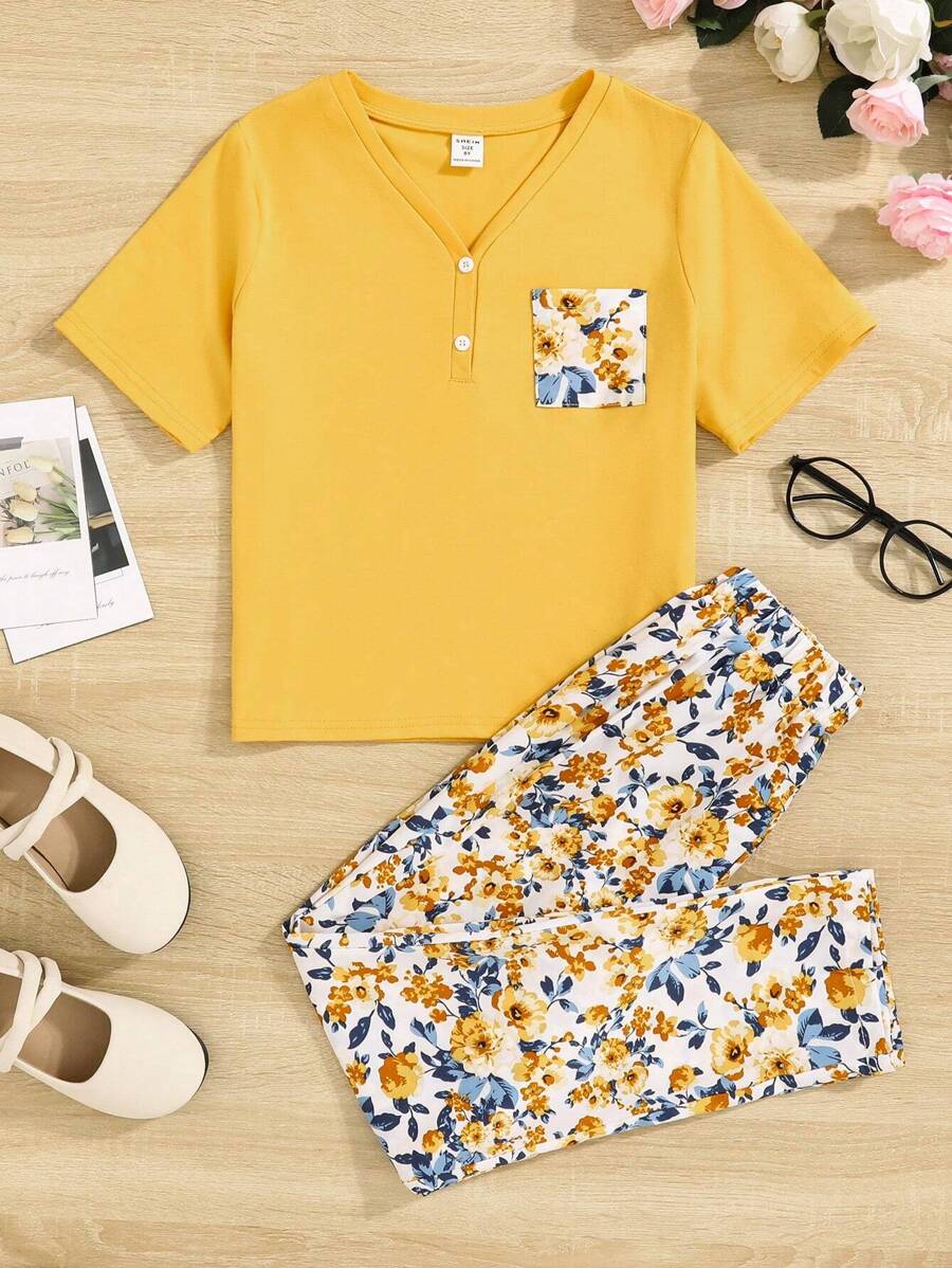 SHEIN 2 件套青少年女孩宽松休闲圆领落肩套头衫和口袋裤家居服套装