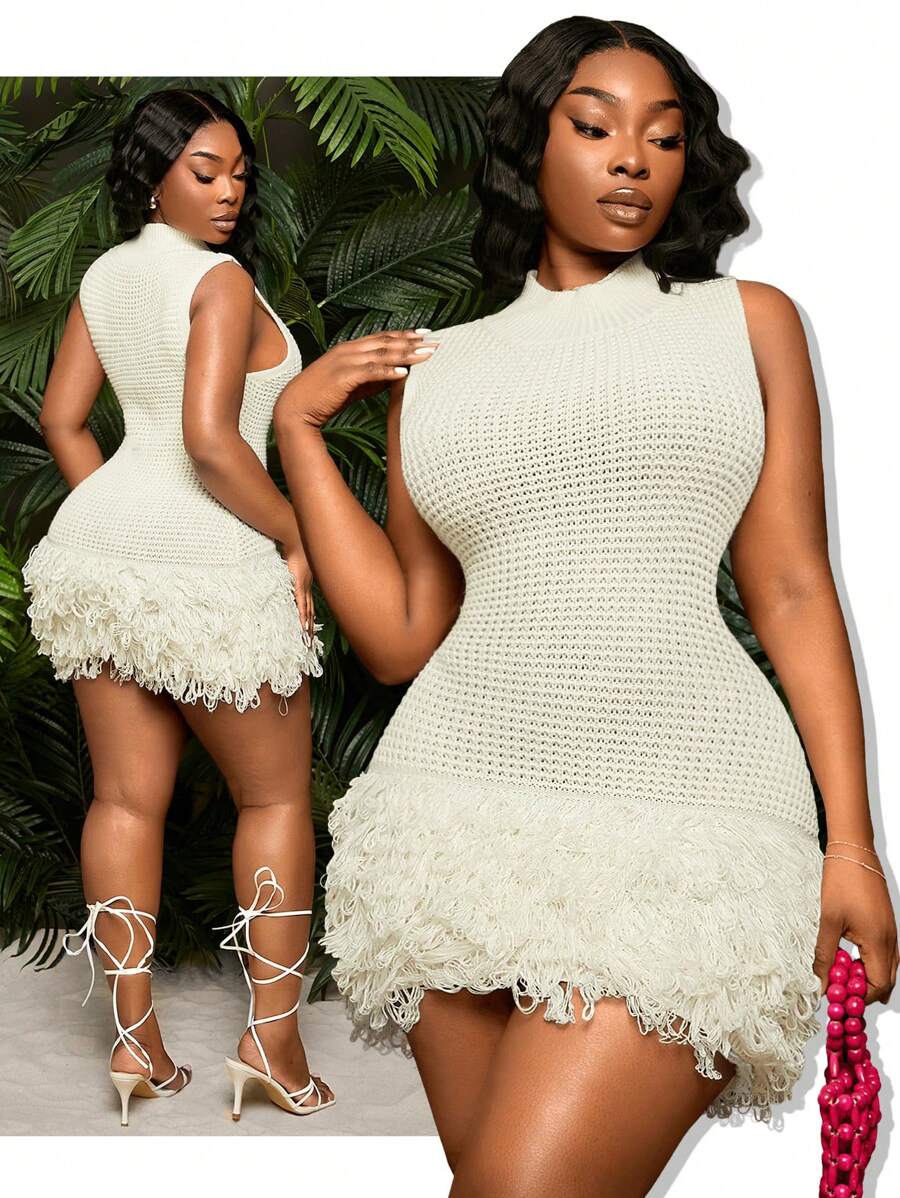 SHEIN SXY 大码女式春夏新款无袖立领镂空流苏迷你紧身针织连衣裙,适合日常穿着、音乐节、音乐会、狂欢派对、海滩度假、约会之夜、生日、单身派对装、俱乐部、可爱、休闲、购物、街头装、外出、易于搭配且看起来苗条、突出您的身材、凸显身材