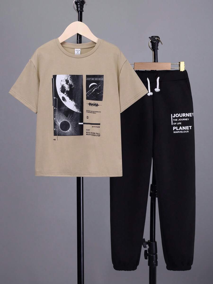 • SHEIN 男大童標語圖案T恤&腰部抽繩衛褲 - 卡其色 - 查看 2