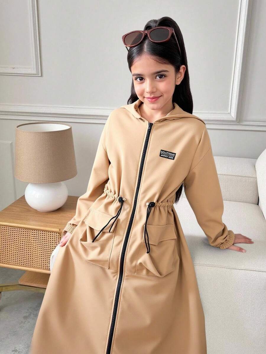 SHEIN 青少年女孩休闲街头服饰时尚法式优雅英伦学院风字母刺绣贴片宽松落肩长袖连帽撞色拉链抽绳腰部大口袋长款羽绒服夹克风衣