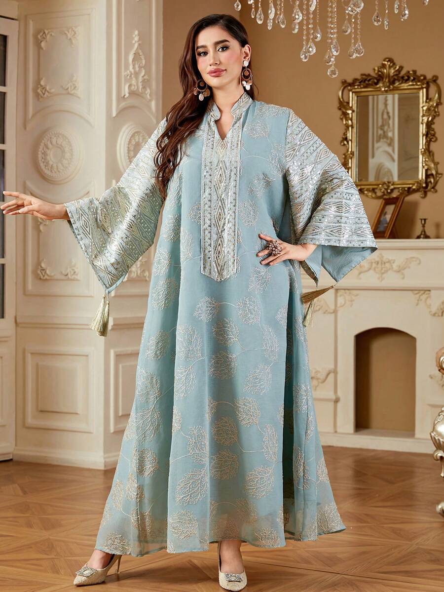 • SISKAKIA 时尚端庄女装植物亮片阿拉伯连衣裙女士流苏派对节日优雅长裙 - 綠色 - 查看 9