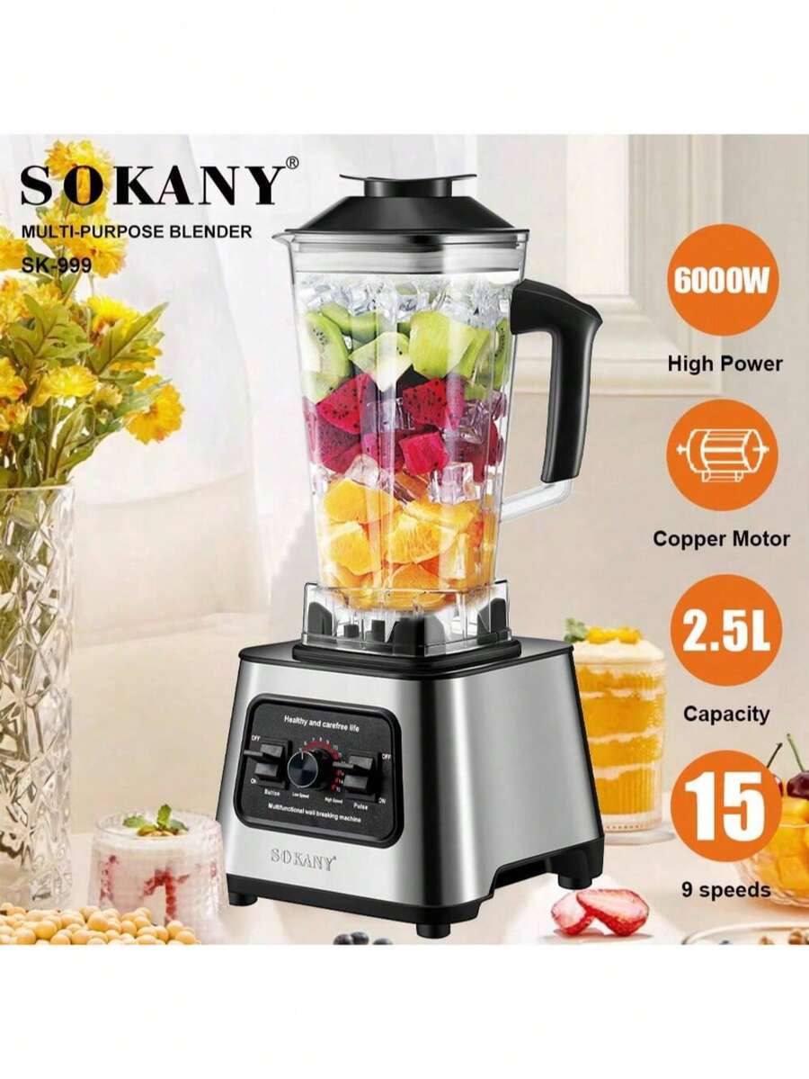 SOKANY999 多功能家用料理机,集榨汁机、碎冰机、食物烹饪机、研磨机和搅拌机于一体。配备研磨杯,二合一设计。2.5升大容量,不锈钢刀片。6000瓦快速粉碎,一键清洁。适用于家庭和商业用途。