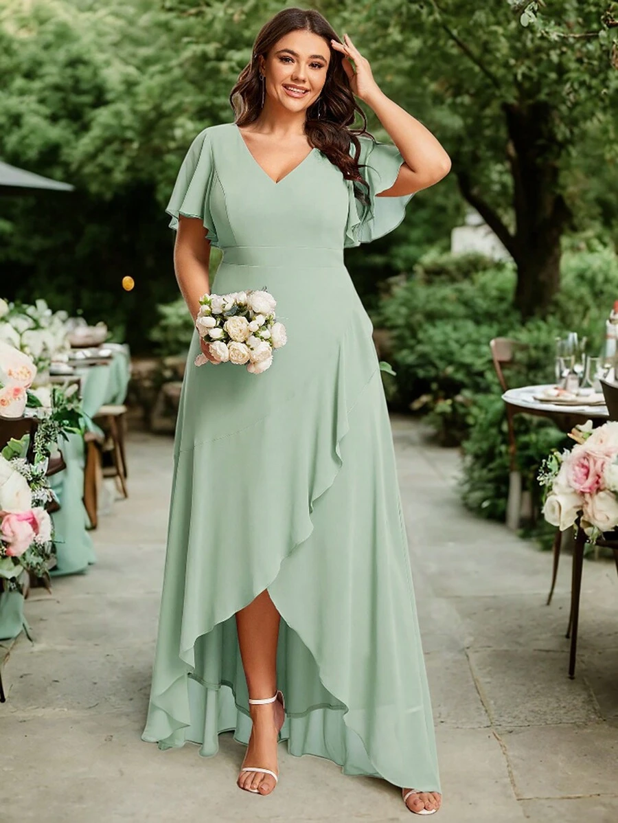 大码V领不对称荷叶边雪纺鼠尾草绿伴娘礼服 冬季婚礼宾客礼服 带袖节日女装