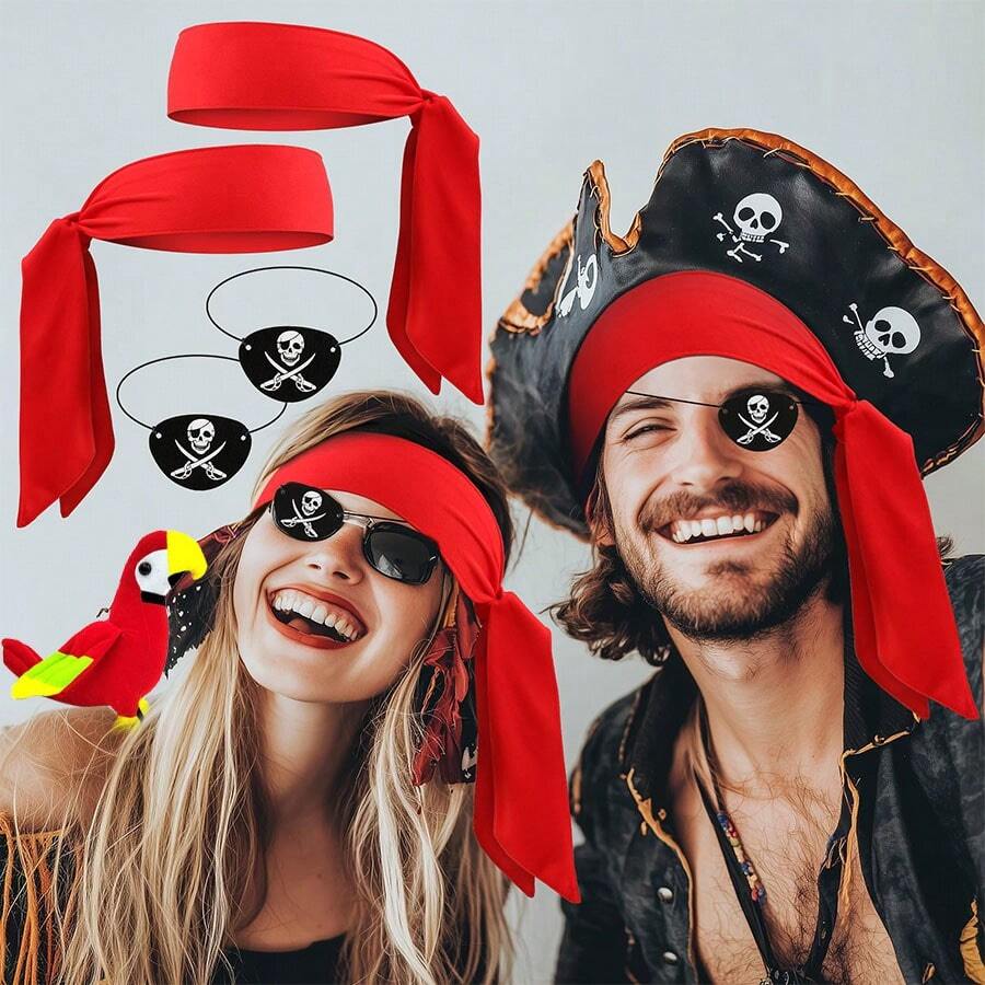Scotamalone 万圣节海盗配饰男女海盗派对用品包括两个红色海盗头带和两个黑色海盗眼罩