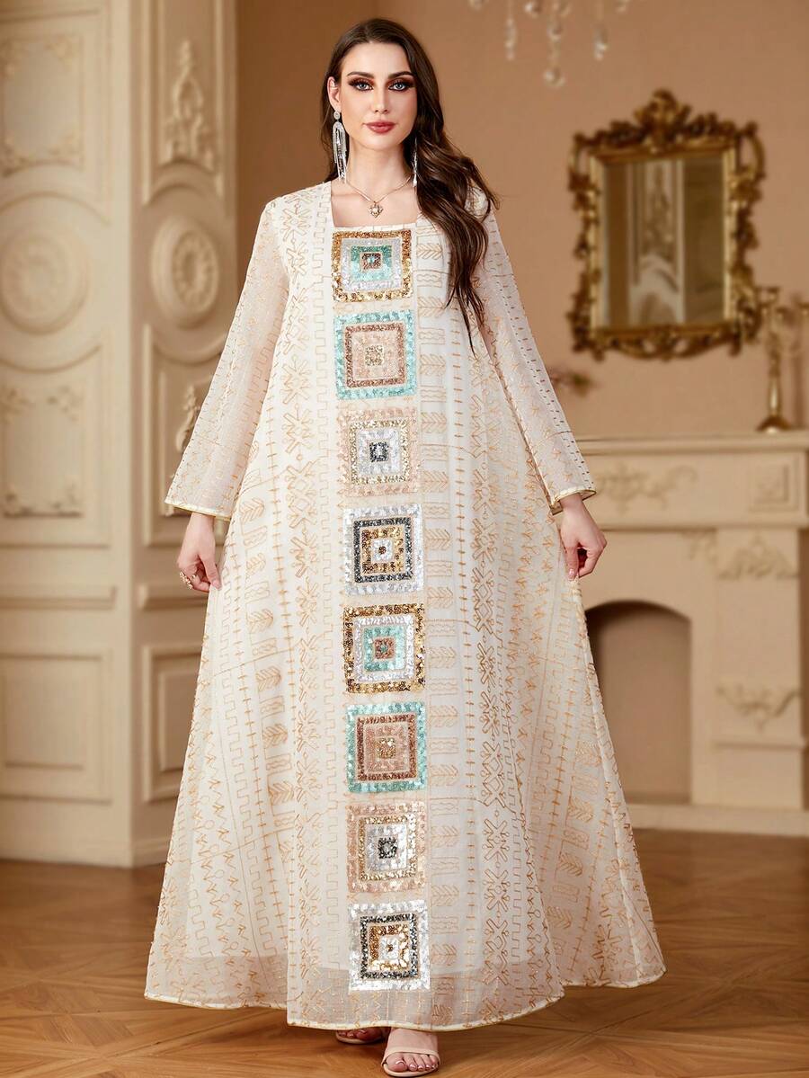 Siskakia 女士迪拜风格亮片刺绣方领长袖派对长袍