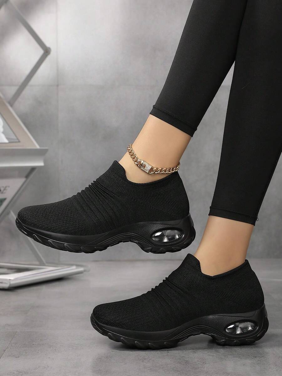 女士运动型黑色纯色舞鞋,适合健身房针织细节一脚蹬运动鞋
