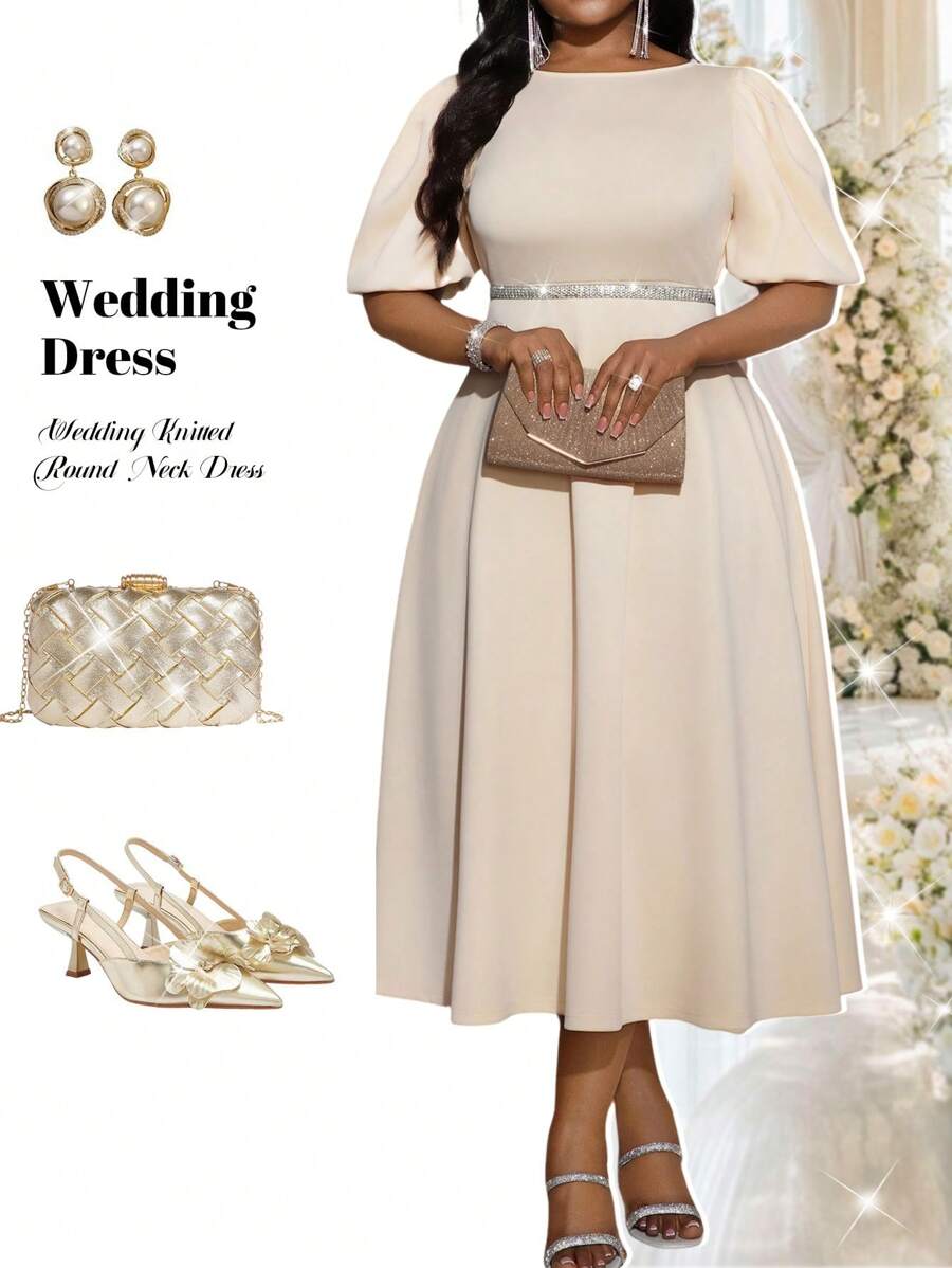 Fleurora 春夏优雅通勤办公室卡其色针织圆领喇叭泡泡袖中长短袖大码连衣裙女士办公室服装女士连衣裙优雅女士夏季服装