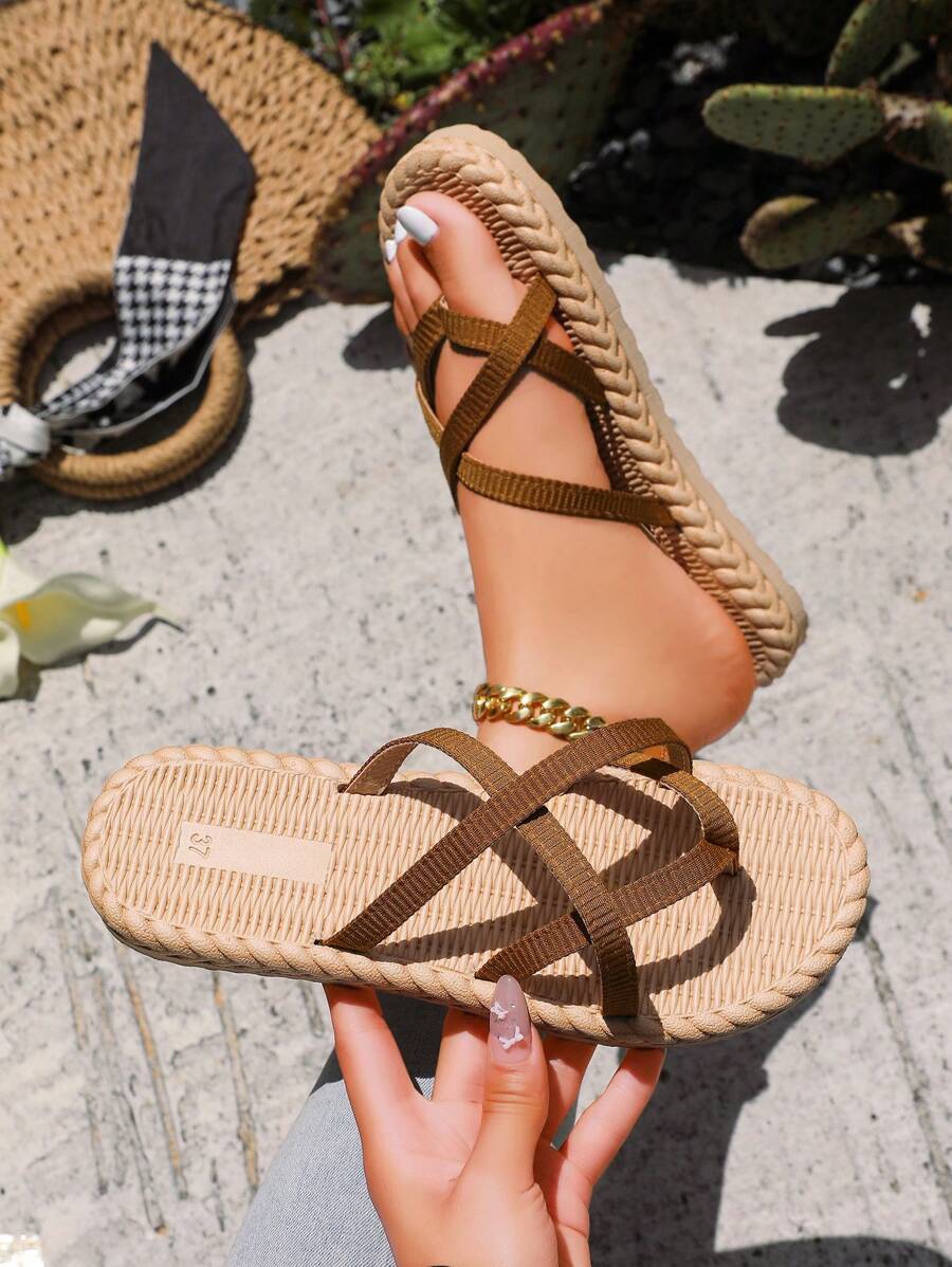 planare 女士时尚休闲度假优雅圆头编织PU露趾舒适日常夏季棕色凉鞋平底凉鞋